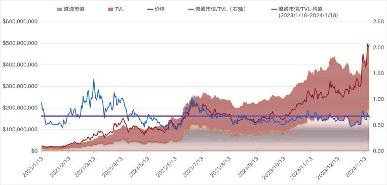截至 2024 年1月18 日,Pendle流通市值/TVL比例均值为 0.66,位于过去12 个月历史均值,具有增长潜力。