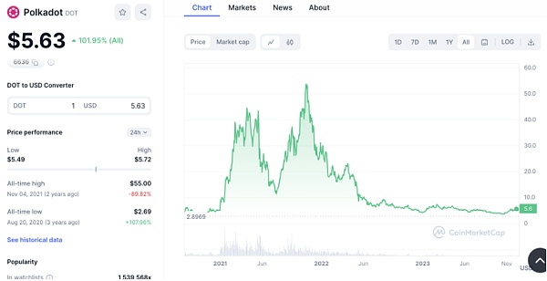 第三,DOT用于“绑定”,这是促进跨区块链交易的方式。根据CoinMarketCap的数据,Polkadot的市值超过94亿美元。在过去的12个月中,DOTToken没有太大波动,仅有不到1%的轻微损失。根据当前价格,DOT的交易价格比其历史最高价低90%。