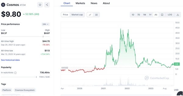 Cosmos拥有一种本地的Layer 1加密货币,ATOM。在使用Inter-Blockchain Communication协议时需要它。ATOM的市值超过了38亿美元。增长幅度相对温和;自2019年以来,ATOM仅上涨了52%。此外,ATOM的价格比历史最高价几乎45美元下跌了78%。