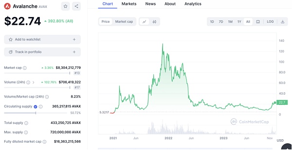 就价格表现而言,Avalanche上涨了63%。虽然这低于行业平均水平,但Avalanche的交易价格比其2021年的历史最高价低了85%。因此,在下一次山寨币季节到来之前,投资者可以获得一个有吸引力的折扣。Avalanche的市值仅略高于130亿美元,因此仍有充足的增长空间。