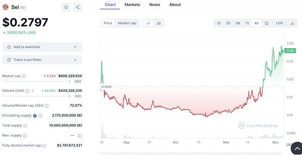 随着我们进入2024年,Sei成为了最热门的加密货币之一。至关重要的是,这是市场上最新的Layer 1区块链之一。根据CoinMarketCap的数据,Sei在2023年8月推出了其本地加密货币SEI。