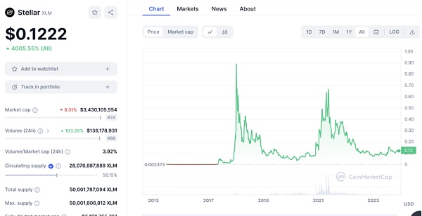 XLM经历了几个牛市和熊市周期。尽管如此,自推出以来,Token上涨了4000%。与先前的历史最高价相比,今天购买XLM的人将获得86%的折扣。XLM的市值为32亿美元。