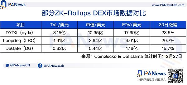 尽管放眼ZK Rollup赛道,包括DYDX和Loopring等DEX不在少数,但DG仍属于低估值资产。从上图来看,虽然DeGate在TVL和市值等方面与其他竞品有着数倍的差距,但其在主网仅刚刚上线一个多月时间。官网数据显示,截至2月27日,其TVL已达6149.4万美元,成交额超1.58亿美元,也足以可见该平台的市场活跃度。而DYDX和Loopring的市场规模增长也侧面体现了ZK Rollup的DEX的发展潜力,也意味着DeGate仍具备不错的发展空间。