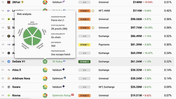 值得一提的是,DeGate在技术成熟度上也被Layer 2数据聚合网站L2BEAT评价为唯一一个Stage2的Layer 2项目,也是30多个Layer 2中仅有的两个获得此最高评级的之一,在数据可用性、可升级性、验证者故障、序列器故障和状态验证这些方面均没有任何风险。