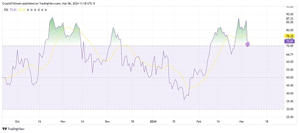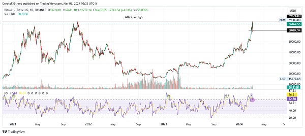 FXStreet的Lockridge Okoth表示,随着加密货币市场的乐观情绪持续高涨,比特币价格可能会重新回到69000美元的关口。Okoth提到,仔细观察比特币相对强弱指数(RSI)可以发现,该指标在70关口附近反弹后,买盘动力正在上升。如果这一轨迹持续下去,RSI可能很快就会突破信号线的黄色带。这种交叉将重振上升趋势,因为它被解释为买入信号。然而如果交易者开始兑现收益,比特币价格可能会下跌,重新测试65000美元的门槛。在最糟糕的情况下,比特币可能会暴跌至60000美元的心理水平,然后再次上涨。