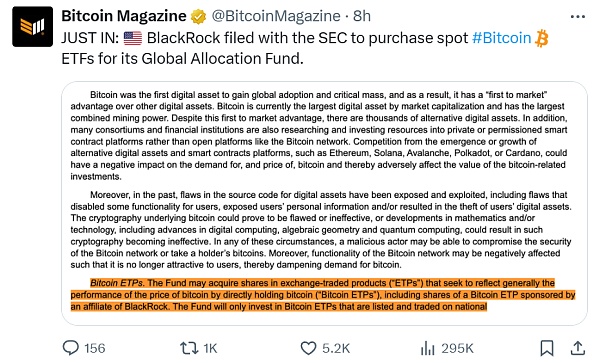 就在此时,贝莱德在公开监管文件中宣布,已向美国证监会申请在其全球配置基金(Global Allocation Fund)中纳入比特币现货ETF敞口。随着比特币价格的飙升和比特币现货ETF的增长,贝莱德希望使该基金成为其客户更强大的产品。