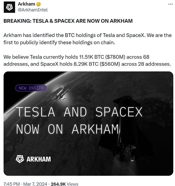 加密货币情报公司Arkham昨(7)日稍晚在X上发文表示,已经对电车大厂特斯拉(Tesla)和SpaceX持有的比特币进行追踪。值得注意的是,他们发现特斯拉目前在68个地址中持有约11510枚BTC(约7.8亿美元)、SpaceX在28个地址中持有约8290枚BTC(约5.6亿美元)。