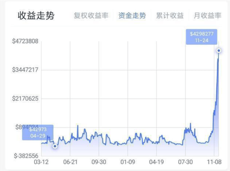 根据币Coin平台公开的实盘数据,肥宅的账户总资产已达4,303,131美元,折合约2700万人民币,累计收益率高达3316.69%,月收益率更是达到惊人的482.81%。特别是从3月12日起,他的账户累计收益已飙升至5,841,895美元,约合3740万人民币。