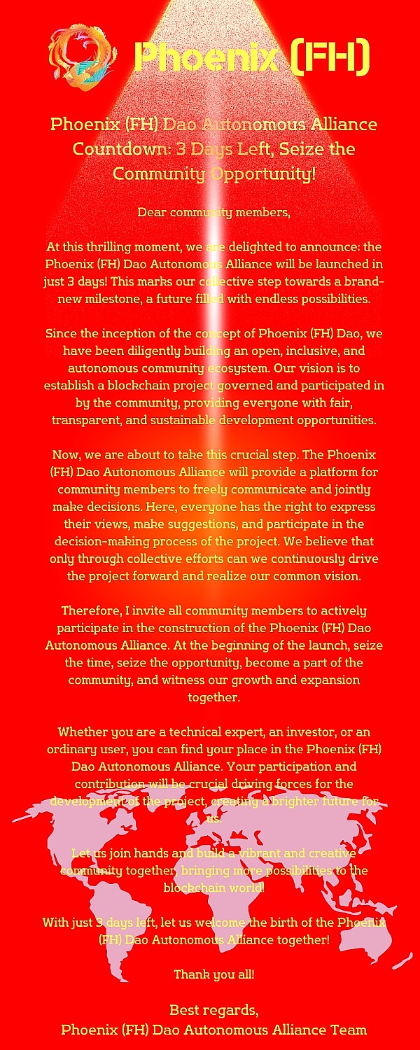 At this thrilling moment, we are delighted to announce: the Phoenix (FH) Dao Autonomous Alliance will be launched in just 3 days! This marks our collective step towards a brand-new milestone, a future filled with endless possibilities.