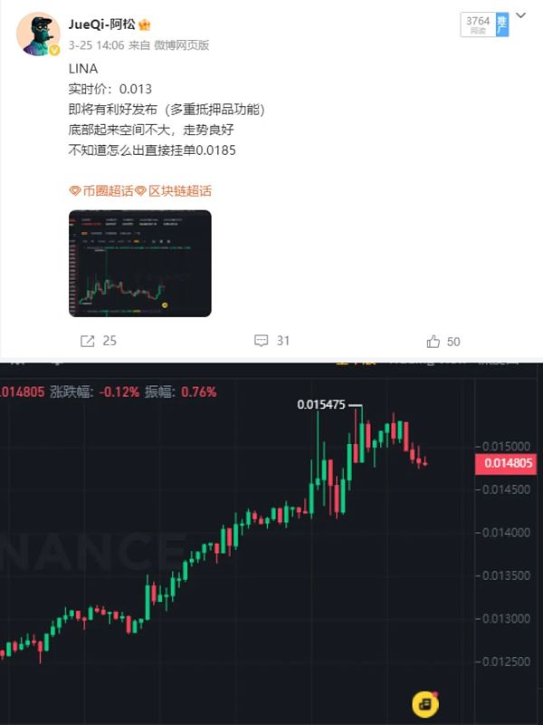 再就是在25日也就前天,又推荐了LINA,目前空间也有14%,目前的走势还是很良好的,底部向上走的很稳,慢慢在抬高,之前给的0.185的止盈位置还是可以去挂的,坐等收米就好了
