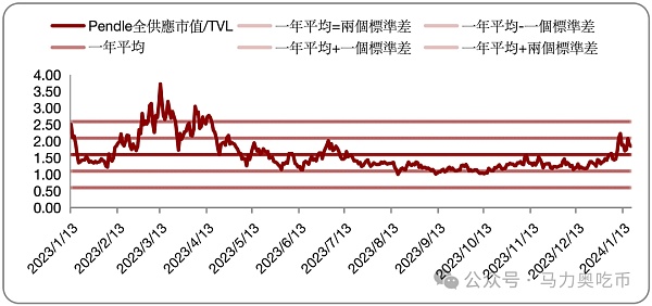 进一步分析比较过去一年 Pendle 的全供应市值与 TVL 比例可以发现均值在 1.59 位置,而目前 1.85 的估值水平与一年平均相若,低于平均加上一个标准差 2 倍的水平,相比 2023 年 3 月 2.5 倍的估值相对理性。