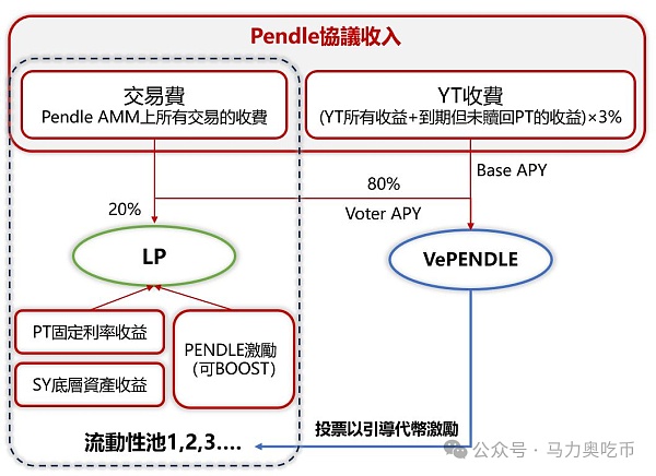 PENDLE 代币激励:根据该流动性池获得的 VePENDLE 票数,按比例分配每周释放的代币激励。