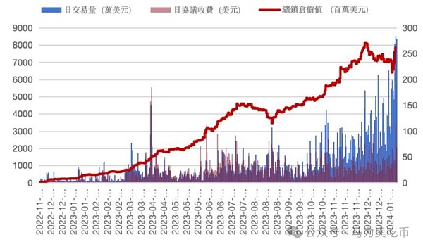 图表 03:协议收费随总价值锁仓(TVL)、日交易量震荡攀升