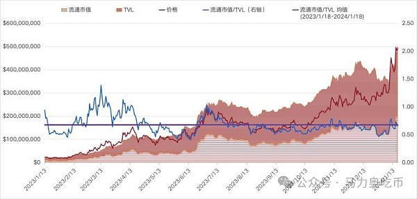 截至 2024 年 1 月 18 日,Pendle 流通市值 /TVL 比例均值为 0.66,位于过去 12 个月历史均值,具有增长潜力。