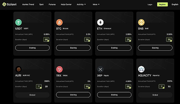 ● Salavi平台提供了质押赚币的功能,让用户将自己的加密货币质押在平台上,并获得相应的奖励。