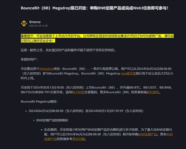 BNB是CZ发行的他手里肯定有很多的币子,这也是为啥现在币安要弄一个BB出来,后面大概率就是BB会逐步的取代BNB,这个Megadrop项目 - BounceBit(BB),一条BTC再质押公链。目前是需要质押BNB获取积分,锁仓BNB!这样做的目的无非就是去CZ化,因为新的BB新的模式,哪怕后面CZ出问题了,也影响不到币安!