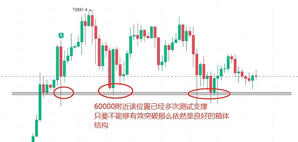 特别是像当前这一段落,长时间的宽幅震荡会给非常多的人认为牛市结束的错觉。我们在过去也着重强调过从结构出发,首先是确认趋势,在趋势当中去找结构,结构当中去找波段,波段当中再找到多空的入场点,去确认止盈止损位。所以我们目前依然是之前的观点,虽然这段行情的反弹力度比较弱,只到箱体中轴,缓涨急跌。多头疲软并不意味着行情就已经发生反转,我们应该考虑目前价格所处的位置其实是在整段宽幅震荡箱体的中轴以下,接近底部箱体的支撑处,结构依然没有被破坏那么我们的思路就应当继续以多头为主。