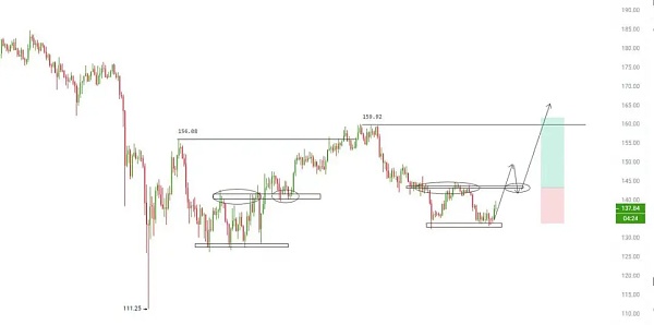 Sol在下方暂时确认底部支撑,但,并未看到明确的反转信号。对于山寨,我并不建议在下跌段落中左侧摸底,失误率较高。如果能够带量突破阻力区域,做突破追入,是更为合理的方案。