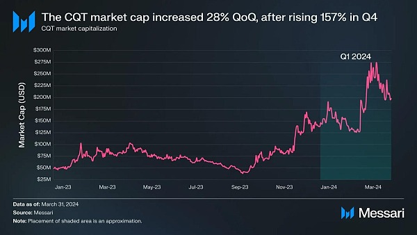 尽管 CQT 代币流通供应量增加了 20%(新增 1.04 亿枚 CQT),但 CQT 的质押百分比仅从 2023 年第一季度的 22% 增长到了 2024 年第一季度的 29%。