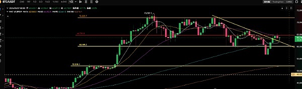 昨日的BTC日线显示出30日均线的明显压制作用,导致大饼价格冲高后回落并收取了阴线。从日线图来看,大饼价格刚好回撤至日线14日均线62700附近。目前市场处于多空交战阶段,上方的首要阻力位于64800,其次是67000。对于多头而言,目前的压力相当大,形势并不容乐观。短期内重点关注下方的62000点。