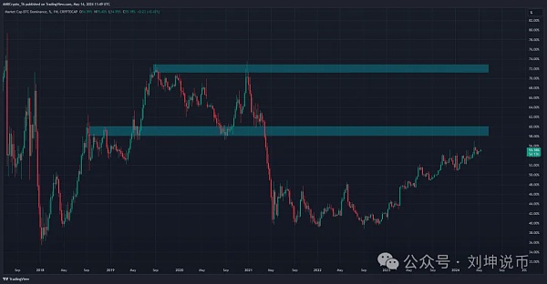 一旦比特币的主导地位开始下降,山寨币市场可能会变得更加看涨。下图显示了比特币在加密货币总市值中的占比。
