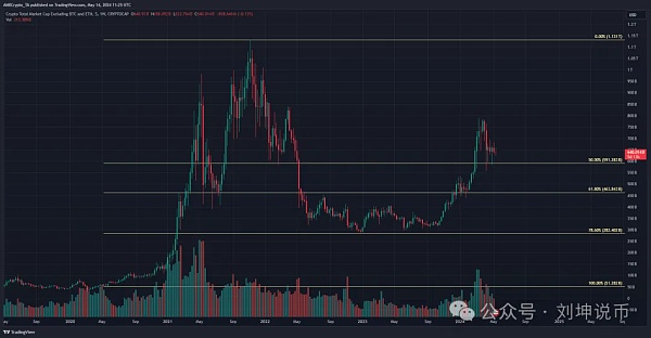 将山寨币市值图表与BTC.D图表进行比较,我们可以发现,在比特币主导地位下降期间,山寨币的涨幅最大。