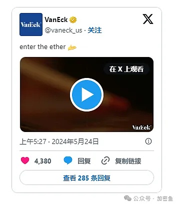 另外根据SEC 官网最新资料,发行商VanEck 已第一时间提交以太坊现货ETF 修订后的S-1 申请文件。甚至在今晨接近五点半左右,就在其X 帐号上贴出一则以太坊广告。