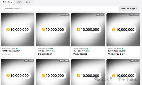 3月初,Notcoin推出了一项功能,允许精英玩家将大量游戏内货币转换为NFT代金券,这些代金券可以在其代币正式发行之前进行交易。玩家可以选择用1000万或1亿游戏币换取优惠券NFT。当前该NFT已上线TON 生态 NFT 交易平台 Getgems及NFT碎片化平台Shardify进行提前交易和定价,当代币正式在链上发行后,NFT可兑换为代币。简单说就是选择用 1000 万或 1 亿游戏币换取优惠券 NFT。代币正式在链上发行后,NFT 可兑换为代币。空投活动已过去,3 月底或 4 月初进行的。