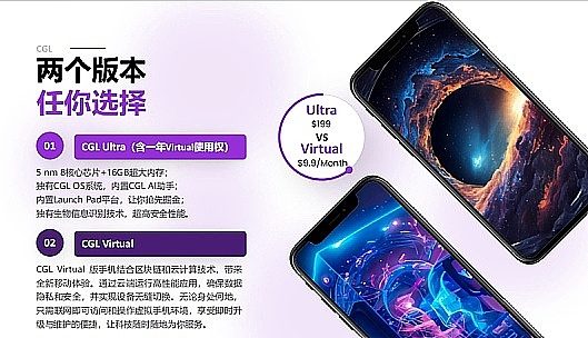 CGL Ultra版搭载5nm 8核心芯片和16GB超大内存,运行速度和流畅度无与伦比。独有的CGL OS系统内置AI助手,提供智能推荐和语音助手功能,日常生活更加便捷。内置的Launch Pad平台,让用户参与Polygon生态项目首发空投,捕捉最新的科技投资机会。售价199美元,还包含一年的Virtual使用权,性价比极高。