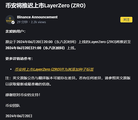 币安发布公告称,将于2024年6月20日21:00(东八区时间)上线LayerZero(ZRO)!并为其添加种子标签。