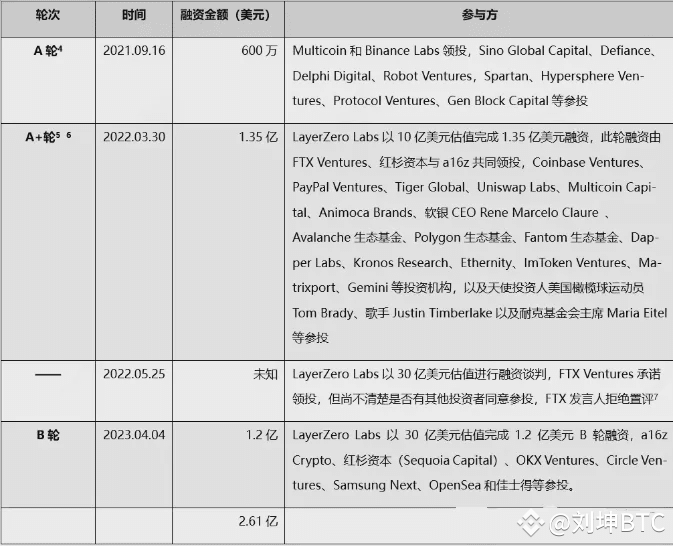 2022年3月,LayerZero Labs以10亿美元估值完成1.35亿美元A+轮融资,a16z、FTX Ventures、红杉资本共同领投,Coinbase Ventures、PayPal Ventures、Tiger Global和Uniswap Labs等参投。(2022年11月,LayerZero 发文表示,已从 FTX/FTX Ventures/Alameda Research 手上回购 100% 的股权、币权及其它任何协议。)