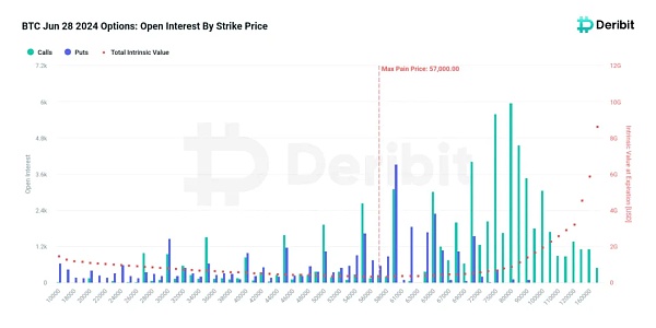 根据最大的衍生品交易所 Deribit 的数据,超过 105K BTC 期权(名义价值 67.2 亿美元)将于 6 月 28 日到期。看跌/看涨比率为 0.52,最大痛点为 57,000 美元,比特币价格更有可能继续承受抛售压力。