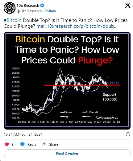 加密货币研究公司 10x Research 的创始人 Markus Thielen 表示,由于现货比特币 ETF 资金持续流出,BTC 价格走势显得疲软,现在是做出艰难决定的时候了。他预测,由于双顶模式的形成,比特币可能跌至 50,000 美元,关键支撑位在 60,000 美元。