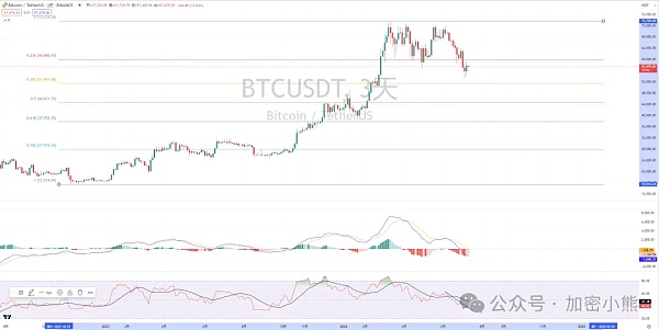 2、如果73777→现在的调整是针对15476以来的上涨;那么本轮回撤的斐波那契0.382在51500左右,0.5在44600左右,从RSI指标来看,目前的指标已经位于起涨点附近;
