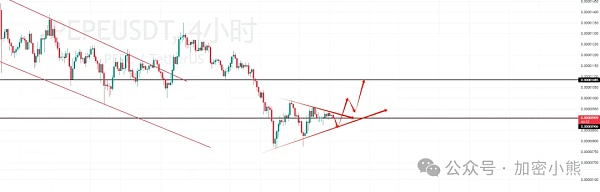 PEPE小级别触及三角上边沿线再次被打了下来,本以为会直接突破,不过等一波回踩0.0090附近可以补仓,只要不跌破0.0085问题都不大,也是羡羡的止损位置