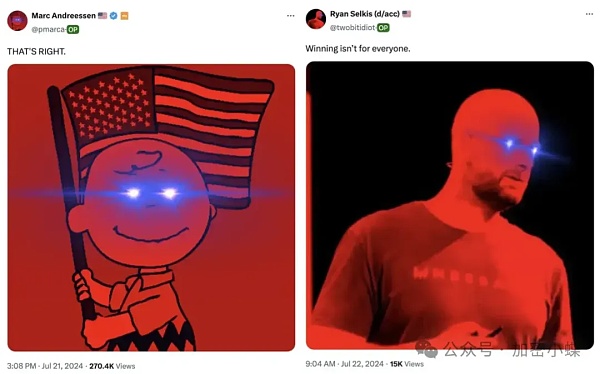 社区随即发现,a16z 创始人 Marc Andreessen、Messari 创始人 Ryan Selkis 都已经将头像换成了「同款」激光眼以代表对特朗普的支持。