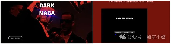 这张图片由名为 DarkMagacoin 的网站制作生成。DarkMagacoin 是在特朗普枪击案之后,社区基于特朗普著名举拳照片为 IP 推出的一个图片制作网站,以「黑暗 MAGA 爱国者掌控一切」为宣传口号。社区粉丝可以通过官网提供的工具生成同款暗黑激光眼图片。