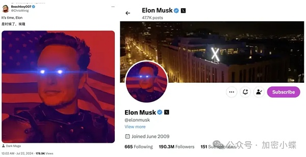 近几日,马斯克在自己的推特账号上频繁转发与美国政治相关的内容,并明确支持正在竞选的特朗普。今日凌晨,一位网友 @Chriswinig 在马斯克转评纽约犯罪率上升11%的推文下留言:「It's time!」,并附上了一张马斯克原头像带激光眼的「Dark mask」图片。
