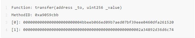 这笔事务的输入数据为0xa9059cbb0000000000000000000000004bbeeb066ed09b7aed07bf39eee0460dfa26152000000000000000000000000000000000000000000000000002a34892d36d6c74。你可以把这一长串的 十六进制 数据分解一下。开头的 0x 表示这是一个十六进制数值,紧接着的 8 个字节(a9059cbb)是函数标识符,再然后就全部是以 32 字节(也就是 64 个 16 进制字符)为一组的函数参数。所以第一组是 0000000000000000000000004bbeeb066ed09b7aed07bf39eee0460dfa261520 而第二组是 000000000000000000000000000000000000000000000000002a34892d36d6c74。