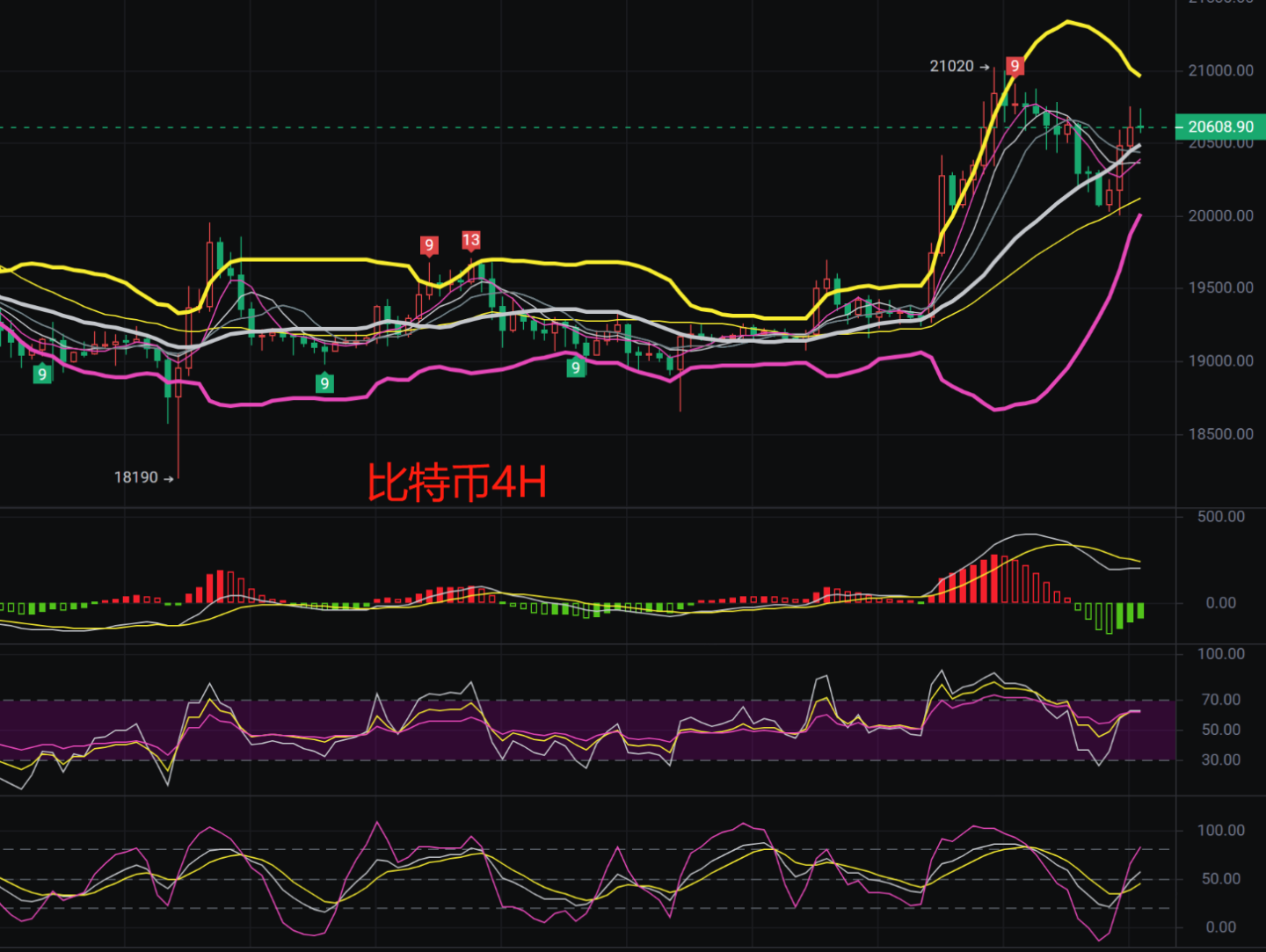 今日周末了又临近月底大概率会出现大行情来搞事情了,我们从四小时图来看行情是走了一个V型反转的走势,底部暂时是被MA30日线支撑住了,现在布林带口缩口,行情运行在中上轨附近,短期压力位将在21000附近,MACDk空头能量柱缩量,快慢线有交叉的趋势,从当前的走势来看多空目前的延续力不强,趋势结构方面,依旧大环境依旧维持弱势,震荡行将会延续区间20800-20000,行情回撤低多进场具体操作裙内给出。