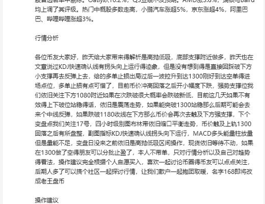 大家好我是老王,行情也没有什么好分析,昨天文章也给大家说得很明白,离2023年也不到两个月了,所有得利空消息都已经完事了,美元指数也在开始慢慢得下滑,现在就等待最后一跌了,目前无法确定这一跌能跌到哪里,如果再次下跌得话那么结构即将完成,后期得时间里也不会轻易再去击穿底部,这个大周期得熊市也会在这一跌过后开始反转进入牛市,老马说比特币会成功,但是需要经过漫长得寒冬,美联储二把手称可能很快放慢加息步伐,作为韭菜得我们一定需要耐心以及一个清晰得头脑等待时机得到来,不要倒在了黎明前,四小时级别图布林带还是依旧缩口平衡走势,昨天给到得建议1200-1300区间操作,今天凌晨最低点来到了1208附近,晚间9点最高好去到了1292刚好多空都是相差8个点,如果昨天在区间操作得朋友也可以吃到不错得利润点,行情走势还是以震荡为主,17号可能会有个小变盘,大家操作期货一定要带好止损点,现货还是那句话依旧等待时机得到来,操作上还是1200-1300区间操作操作,止损根据个人得仓位规划,下方强支撑1080,上方短期压制关注1300-1350,再次说明本人不带单,只讲解行情以及对趋势得一个看法,编辑不易希望大家点点关注点点赞,有需要在火币欧易交易返佣得可以站内留言.