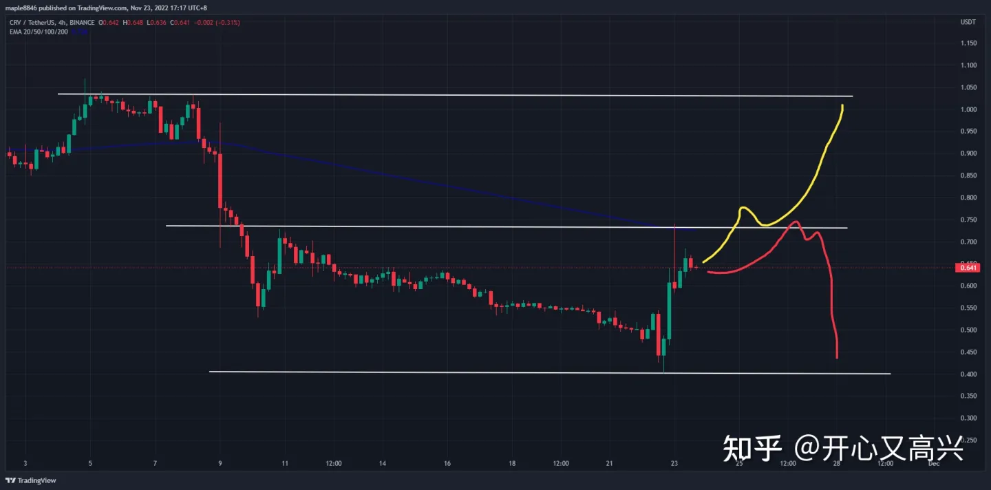 CRV最近也有很多流量,注意中间白色的阻力位,后市有两种走法,第一种 是黄色,突破中间阻力位回踩,然后继续上扬,去摸上方阻力位。第二种是红色,假突破然后被压制,继续下跌,那么中间阻力位就是很好的空单切入点。我会持续观察CRV,我更倾向于红色走线。
