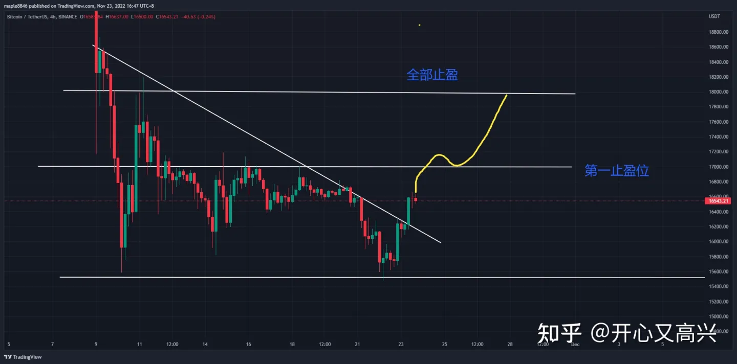 我们先看BTC,21号的笔记提到了饼子有反弹,这两天的走势也印证了我的想法。关于BTC,其实我的看法和前几天并无二致。如下图所示,第一止盈位在16900附近,如果比特币能走出黄线,即突破16900回踩保持16900,我们就可以期待18000的btc,这也是我对后市走法的预期。到了18000就基本可以做空了。