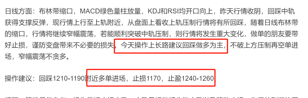 昨天早间行情还在1220附近的时候,长路在文中给出的回踩做多的策略,虽然点位并未进场,但实时策略能拿下一波利润。昨天行情终于走出了一直震荡的区域,让人们看到了曙光。