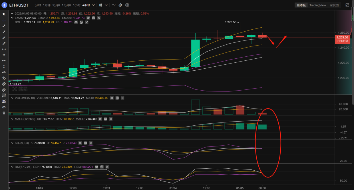 以太坊行情分析:1小时线,布林带平行运行,MACD红色量柱放量,KDJ和RSI均开口向下,行情早间反弹上轨附近承压回落,4小时线,布林带开口,MACD绿色量柱缩量,KDJ和RSI均拐头向下,短期来看,行情有回踩的趋势,下方可关注1230附近的支撑,上方则关注1270附近的压制。