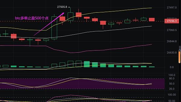 恭喜 昨晚btc在26955最低点布局的多单,完美到达止盈目标27450,止盈500个点 ,ETH也是同步布局的多单,ETH在1742布局的多单,也是完美到达止盈点位1775,完美止盈33个点,详情布局如下: