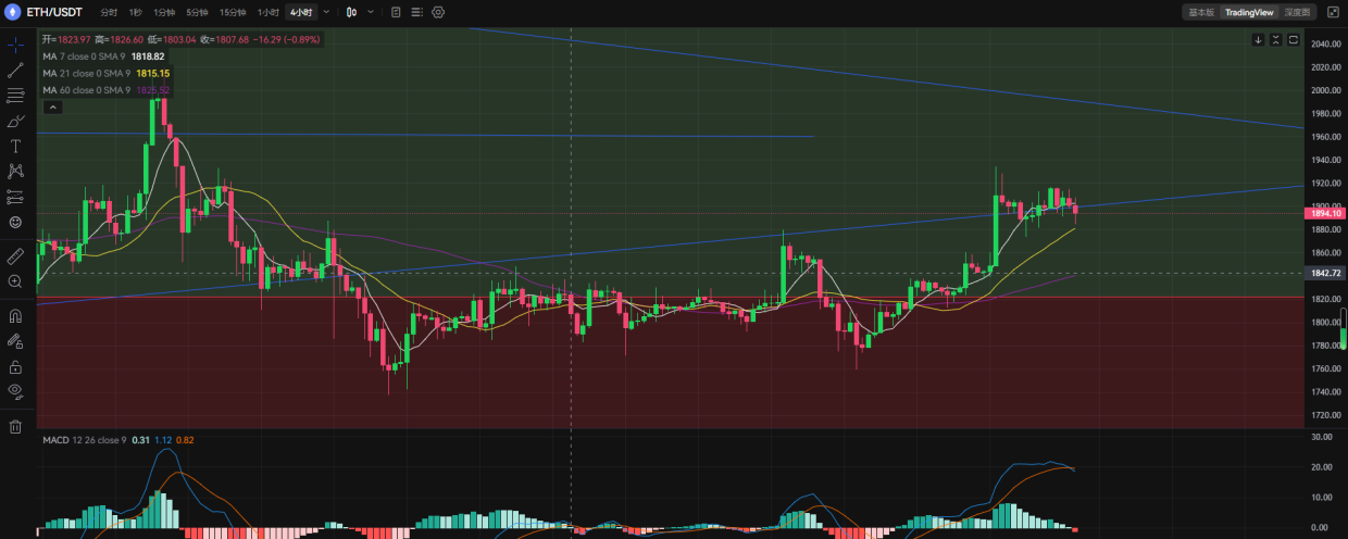 从4小时级别来看ETH在MA21这里也就是1880得到了短暂的支撑,但从MACD来看绿色多头量能缩减红色空头量能有逐步放量之势,白盘重点关注1880一带的支撑,跌破这里下方继续看1865,不过今日跌幅也不会太大,利润也就在35点左右。