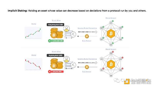 在PoW机制中,成为出块节点的概率与节点所消耗的算力成正比。因此,虽然PoW区块链并没有显性质押机制(注:显性质押机制指用户在智能合约中锁定cryptocurrency,如果违规会被没收这笔钱),但这类区块链却存在隐性质押机制,因为节点不仅会持有网络原生通证,通常还会花钱购买昂贵的硬件设备来扩展算力,以争取获得区块奖励的机会,而且通常这些硬件无法在各个链之间通用。如果miner无法通过mining奖励来获得收入,那么他们花在设备和电力上的成本就白费了。如果网络安全无法得到保障,那么mining设备以及原生资产的市场价值也会下跌,这将间接导致经济损失。