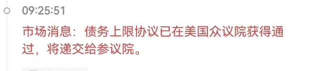 今天早上债务上限的消息落下帷幕漂亮国众议院314票赞成 117票反对通过了债务上限法案,这一消息看似利空,但是后面一句将递交给参议院相当于又把消息延后了,但是落地是迟早的事情,漂亮国不会让自己违约,那么利空也是迟早的事