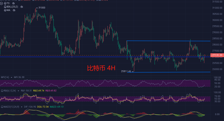 比特币的行情近日都是震荡下行的走势,冲高28500一线后未能延续,逐步回踩,目前回到27000附近运行。行情在非农数据公布之前选择止跌拉升,对于非农的操作主要趋势还是以多为主,好的行情往往需要沉淀。日线4连阴后今日目前也是成功止跌收阳,就目前而言有一定的止跌信号了,3次向下插针证明下方支撑力度较强,4小时级别来目前运行于中轨下方,MACD空头能量柱缩量,双线即将交叉,KDJ三线上扬,短线并不看好继续下行,日内思路低多即可,咱们可关注布林带中轨27200附近,企稳可顺势做多,从目前盘面来看,个人操作建议低多去进行操作。